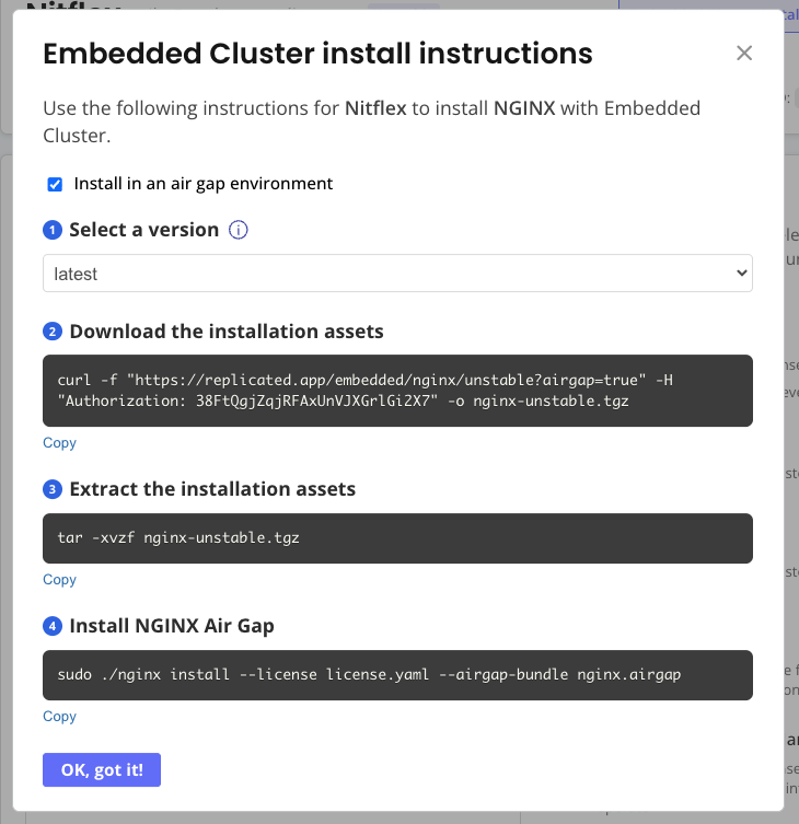 In the Embedded Cluster install instructions dialog, verify that the Install in an air gap environment checkbox is enabled. This checkbox is automatically enabled when the customer license has the air gap install option and an air gap bundle exists for the latest release on the channel.